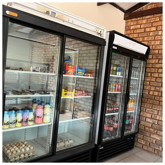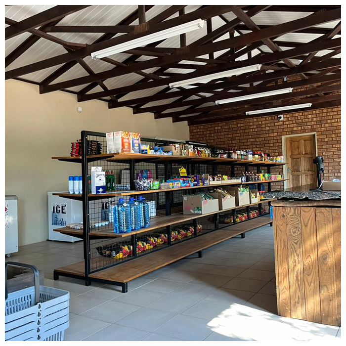 Both the Rotsvy and Suupruim bush chalets are also furnished with bedside lamps, a ceiling fan, electricity points, fully equipped kitchenette, fridge / freezer, microwave, gas hob, as well as a separate, spacious, and private ablution with shower, toilet and basin (in close proximity).