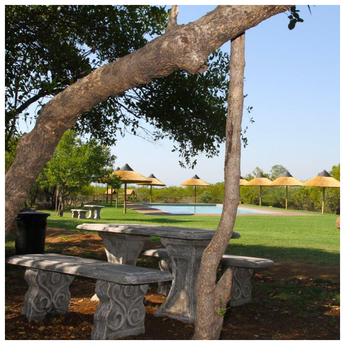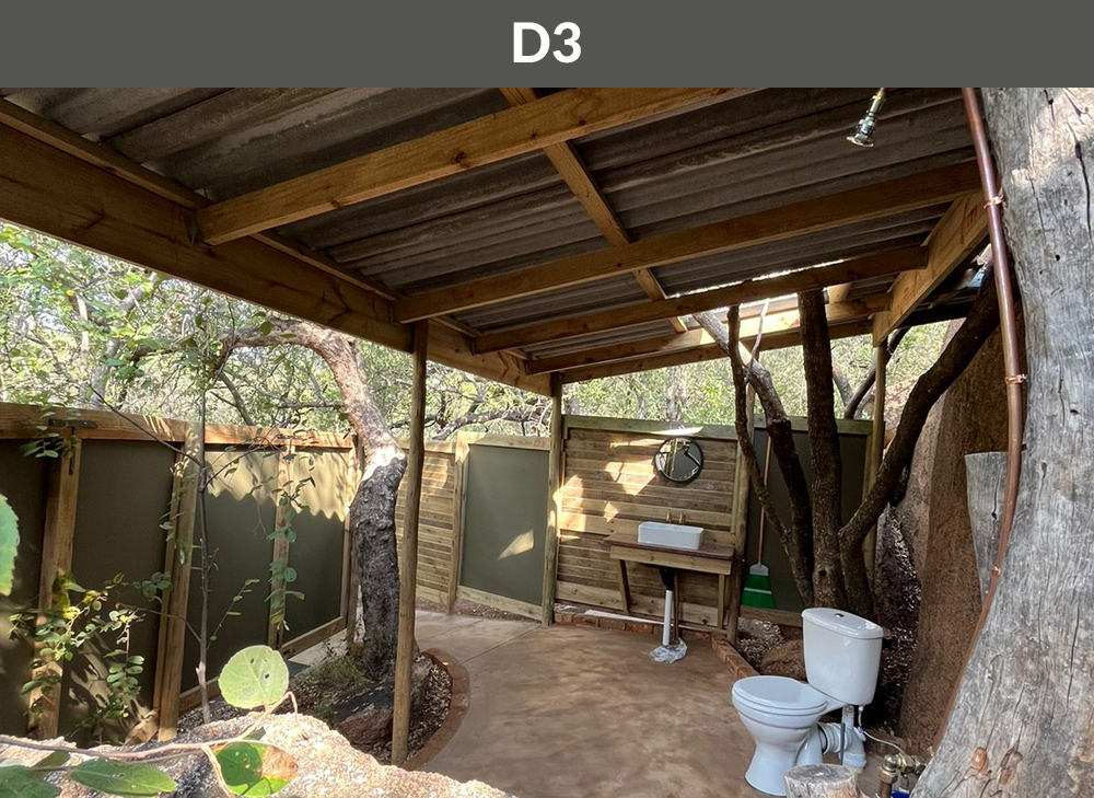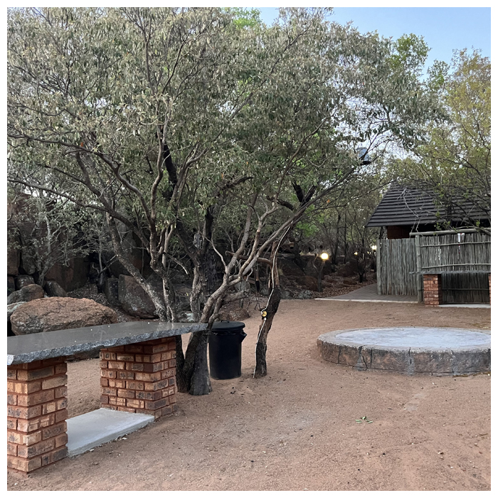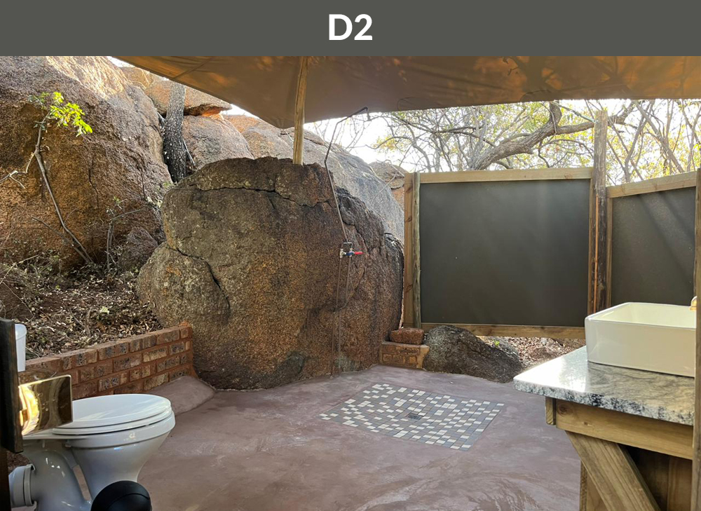 Each campsite has its own ablution with shower, basin, and separate toilet. Camps are equipped with outside lighting on a day/night sensor, a wash-up area, water, electricity point, bin, and braai stand with grid. Camps are located between marula trees, indigenous brush, and a huge rock boulder backdrop. We are also excited about our new one of a kind open air rock ablution, located at A10!