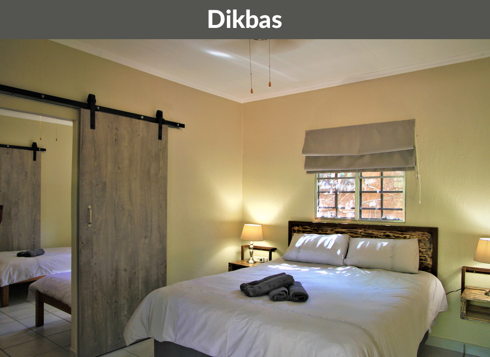 2 x Family Units named Dikbas and Raasblaar (each with 2 interleading rooms), one for adults and the other for children or 2 single individuals. Furnished with a queen size bed and two single beds, bedside tables & lamps, ceiling fans & electricity points. Enjoy your on-suite fully equipped kitchenette with fridge/freezer, microwave, gas hob as well as a separate spacious, private ablution with shower, toilet and basin (in close proximity).