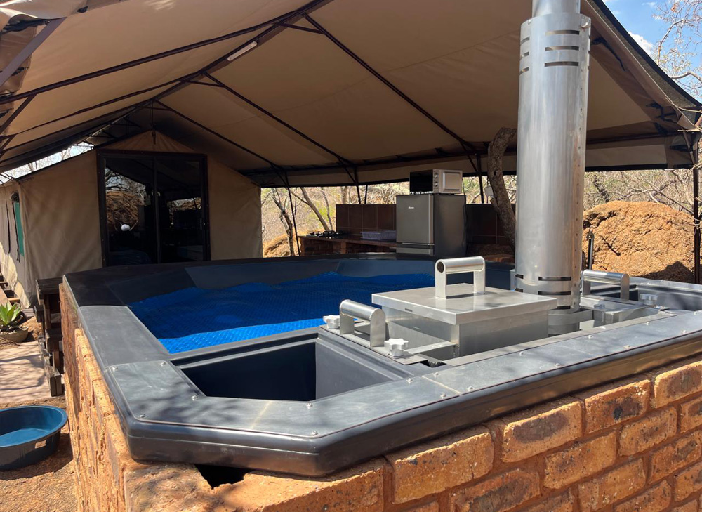 Our Patrys Tent is a stunning, large stand alone tent set onto granite boulders, providing guests with a beautiful sunset views. It is equipped with a braai stand with grid and awesome built-in wood fired Hot Tub. It is furnished with one queen-sized bed, added single bed (by request), a fully-equipped outdoor kitchenette with seating area, fridge / freezer, microwave, gas hob, en-suite bathroom, bedside lamps, electricity points, and allocated cupboard space.